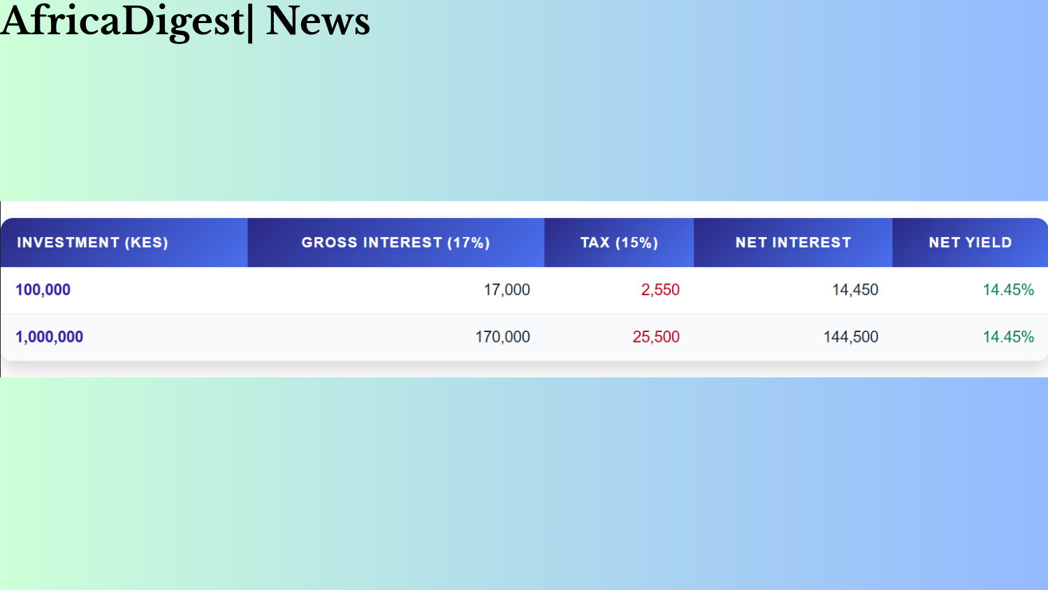 - Net Return: After tax, you earn KES 14,450, giving you a net yield of 14.45% instead of 17%.