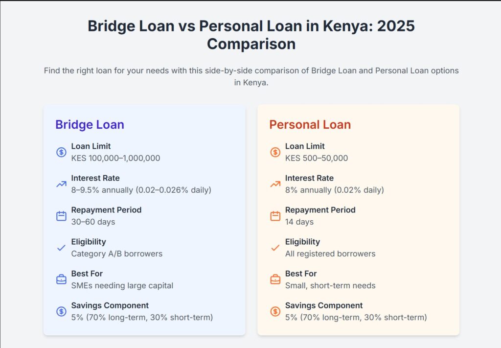 This makes the Bridge Loan ideal for SMEs needing capital for inventory, equipment, or expansion, with rates far lower than private apps like Tala (15–39%) or shylocks (20–100% monthly).