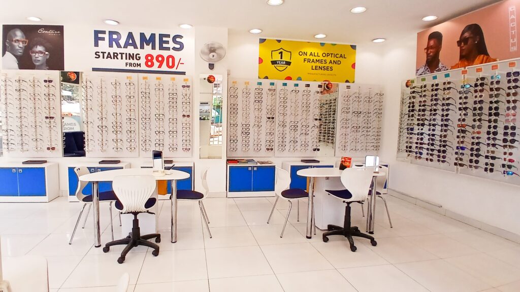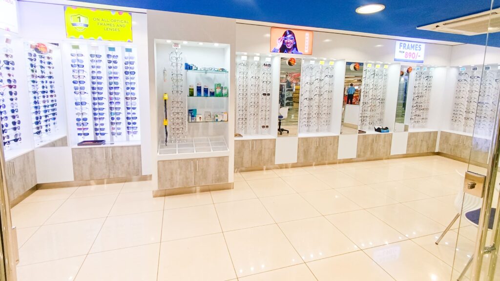 Modern optical retail store environment in Kenya, featuring stylish eyewear displays and customer-focused service areas.